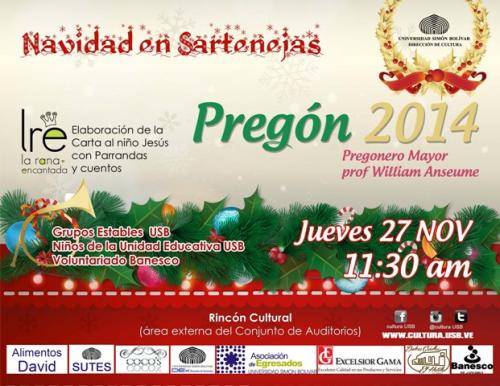 El Pregón de Navidad 2014 cuenta con el apoyo y colaboración del Decanato de Extensión, la Asociación de Egresados USB, el sindicato Sutes, y las empresas Excelsior Gama, Coco´s Pizzería, Dulces Criollos El Hatillo y Alimentos David.
